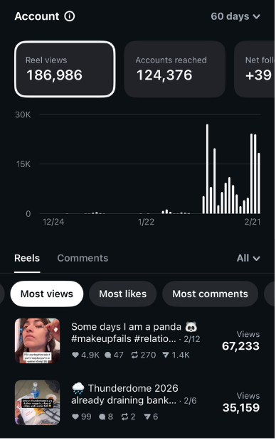 Results (25+ posts, Feb 6-22): Baseline 2k-6k views per Reel, three breakout pieces (69.6k, 14.5k, 10.3k), 92% views from non-followers