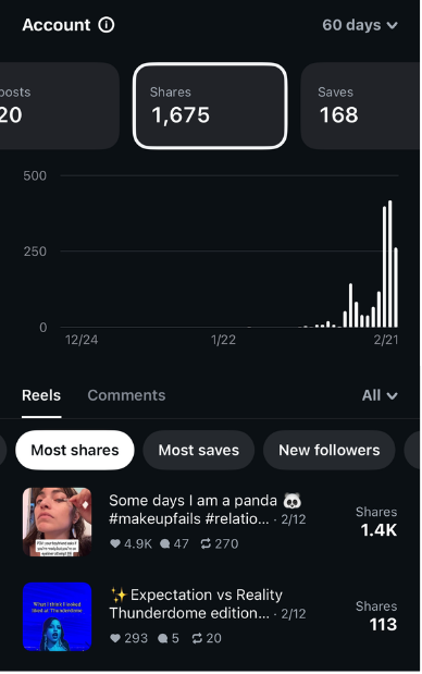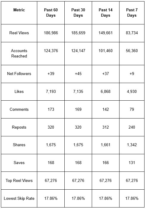 The account demonstrates consistent reach, growth, and strong engagement, with top-performing reels generating thousands of shares, saves, and comments.